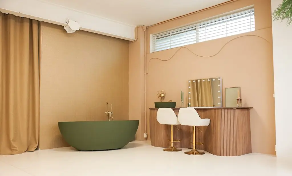Op deze foto’s zie je ons groene verrijdbare bad, de visagie ruimte (die ook heel geschikt is voor foto’s) en een groter stuk van de groene muur, waar je ook uitkijkt op onze karakteristieke buitendeuren.
