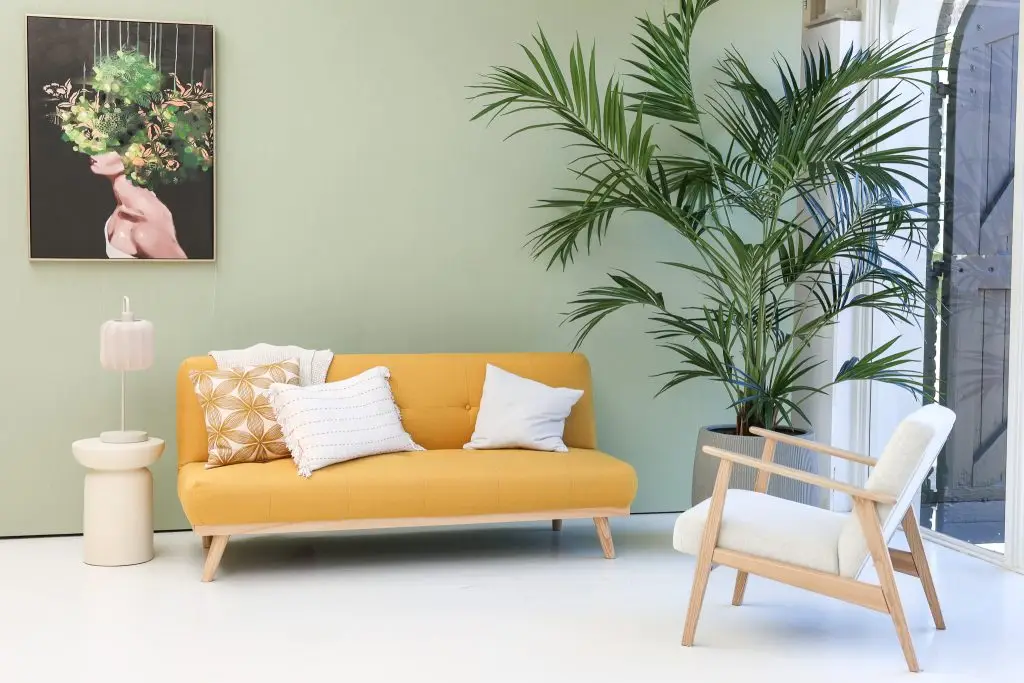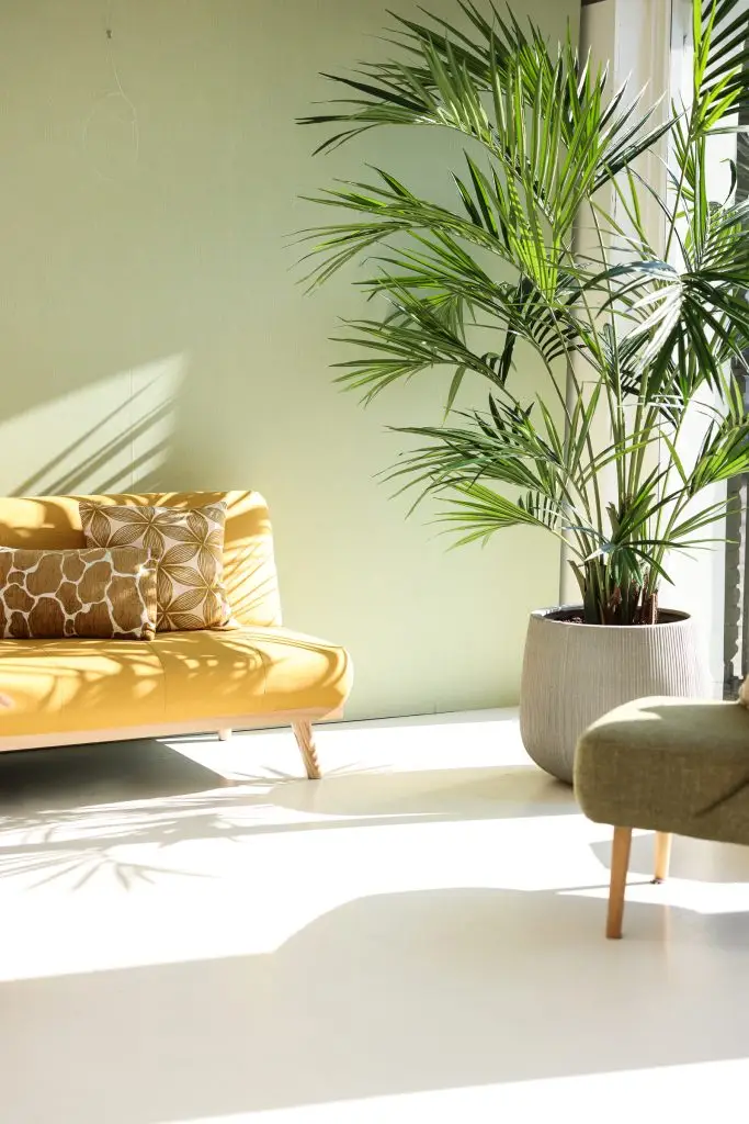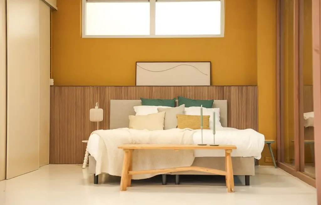 Als je om de hoek gaat (in het minder lichte gedeelte, maar wel goed te belichten met flits of daglichtlamp) is onze okergele hoek met latjeswand. Op dit moment staat het bed ervoor, maar ook met de gele bank of grijze fauteuils ervoor is het echt een heerlijke plek.