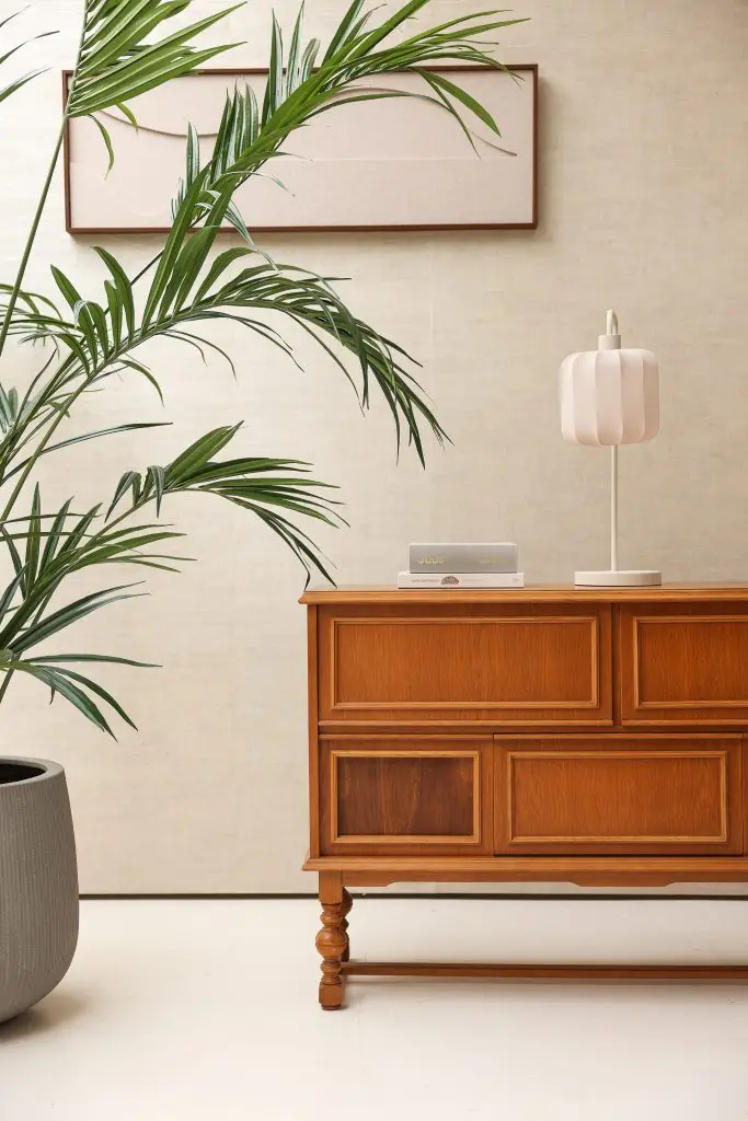 Hier zie je een gedeelte van de groene muur, ons prachtige retro kastje voor de beige wand en de net opgefriste suikerspin roze muur.