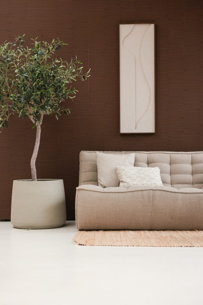 • Donkerbruine muur + roze bank
